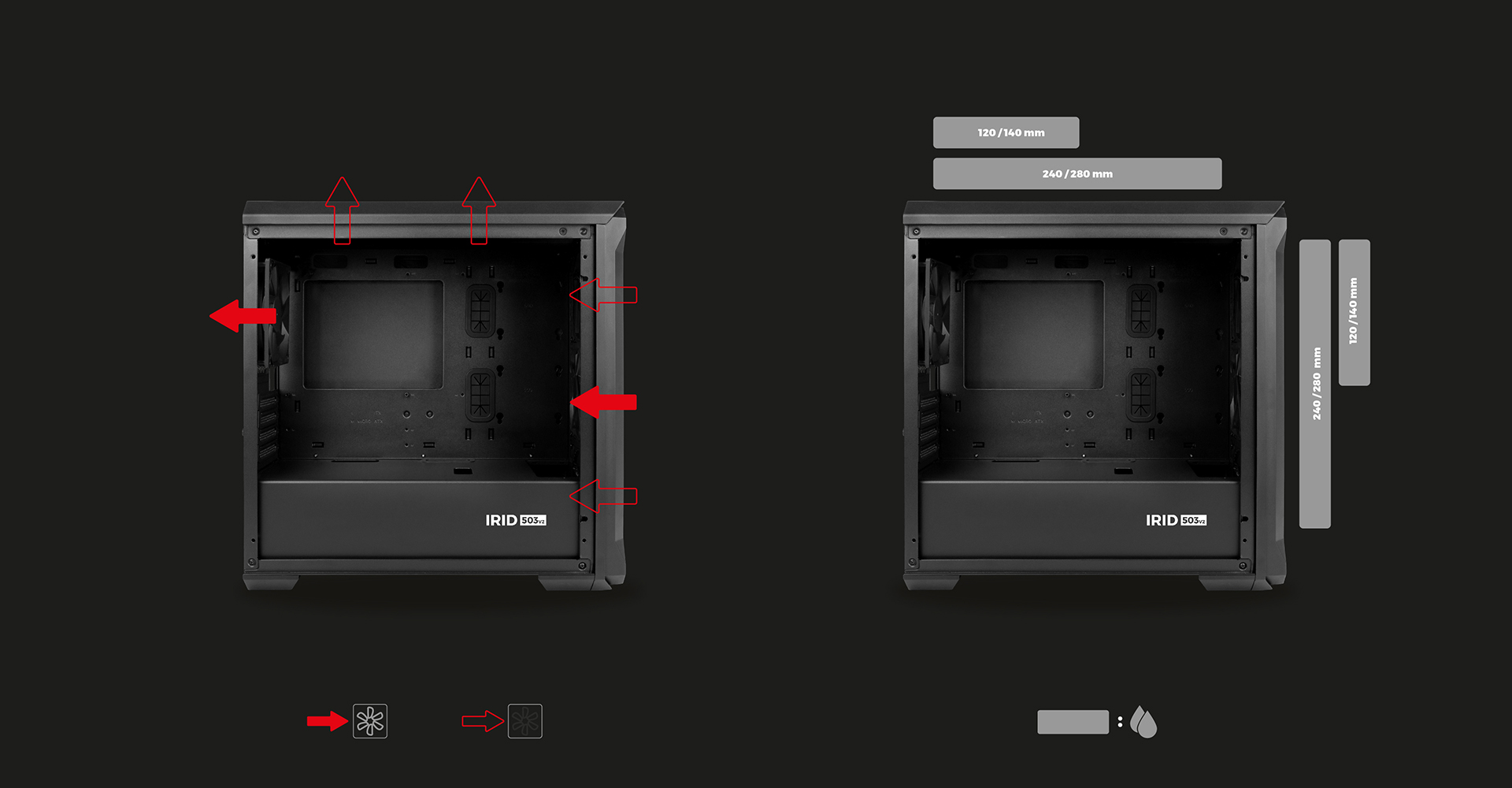 Irid 503 V2 má perforovanou přední část a boční panel je vyroben z čirého tvrzeného skla, které umožňuje sledovat pracovní komponenty. Skříň je vybavena dvěma ventilátory Genesis Oxal 120, které se dokonale postarají o správnou cirkulaci vzduchu.