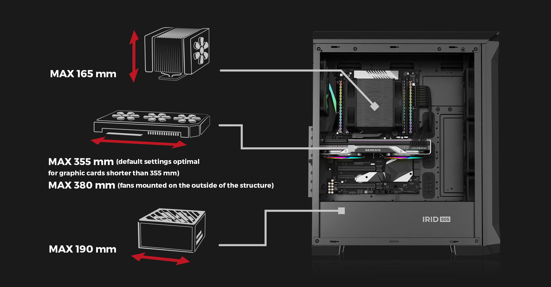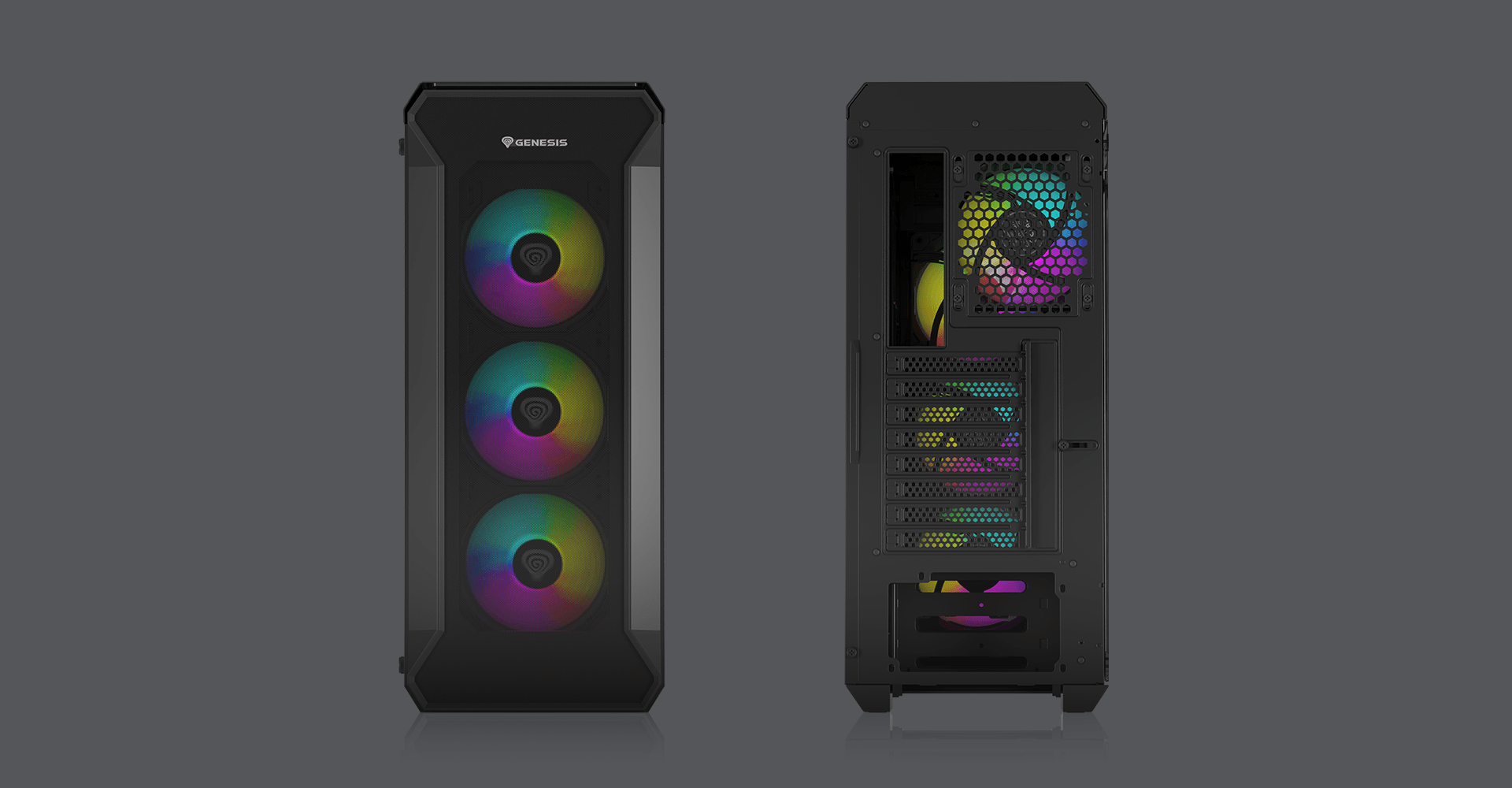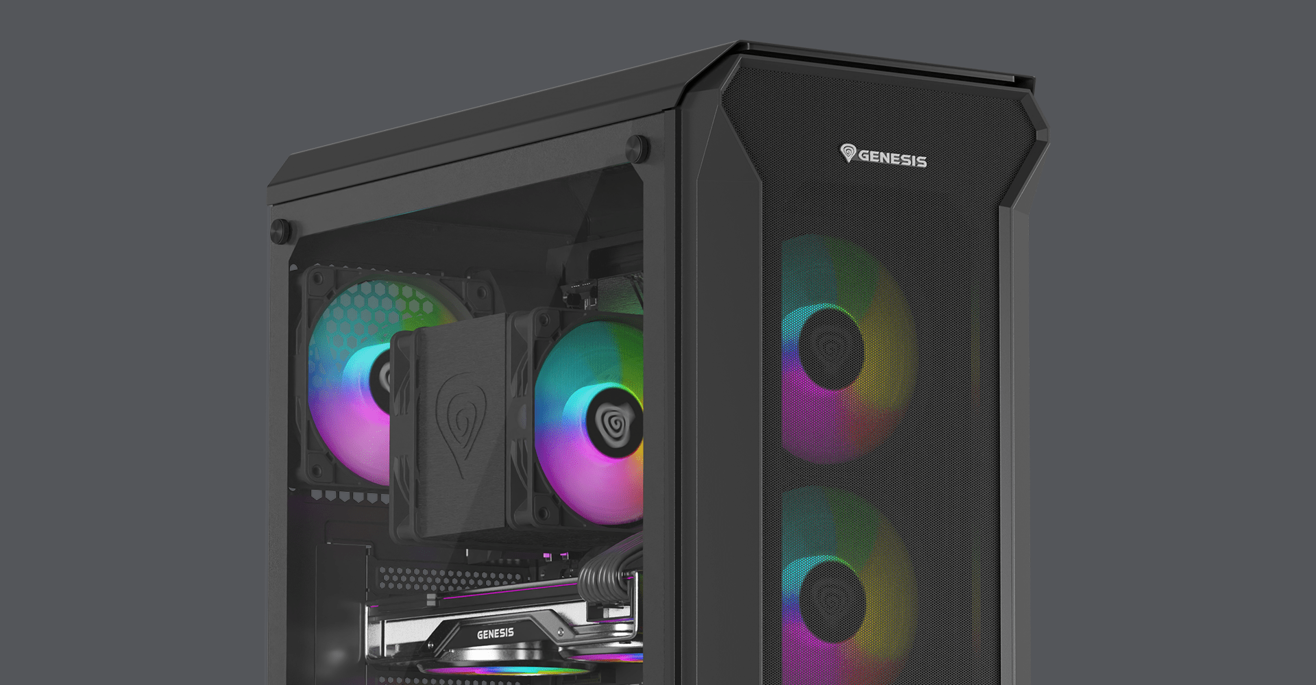 Abyste se s počítačem cítili dobře, musí se i komponenty uvnitř cítit příjemně při správné teplotě. O vaše pohodlí a bezpečnost komponent se starají 4 kvalitní ventilátory Genesis Oxal ARGB 120, které se chovají mimořádně diskrétně. V případě potřeby vám skříň umožní namontovat další - včetně 140mm! Ventilátory jsou standardně namontovány uvnitř konstrukce skříně, což je optimální pro grafické karty, které mají délku až 355 mm. U delších grafických karet (až 380 mm) zajistí nejlepší proudění vzduchu konfigurace s předními ventilátory přemontovanými mimo konstrukci, což můžete snadno provést sami.