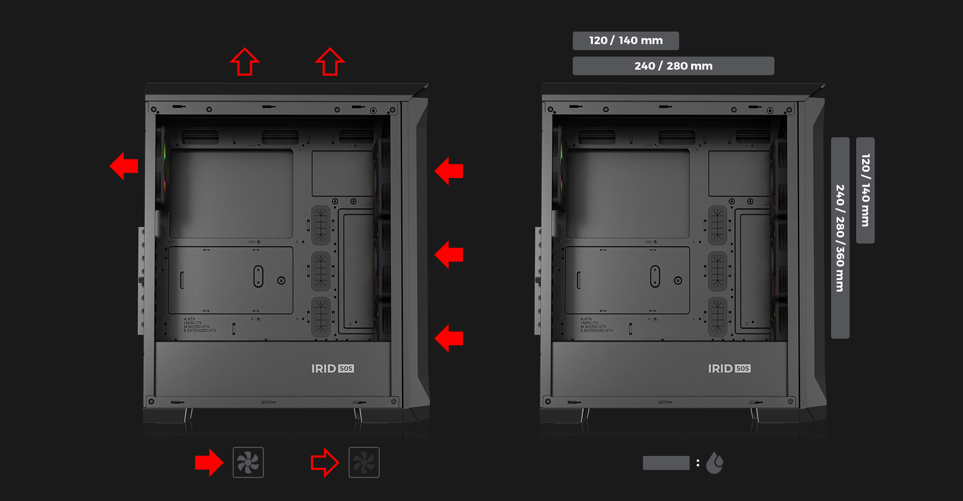 Skříň je vybavena čtyřmi robustními a velmi tichými ventilátory Genesis Oxal ARGB 120. Irid 505 V2 ARGB navíc umožňuje montáž dalších dvou ventilátorů, včetně 140 mm na přední a horní straně. Díky tomu může mít vaše skříň až šest ventilátorů!