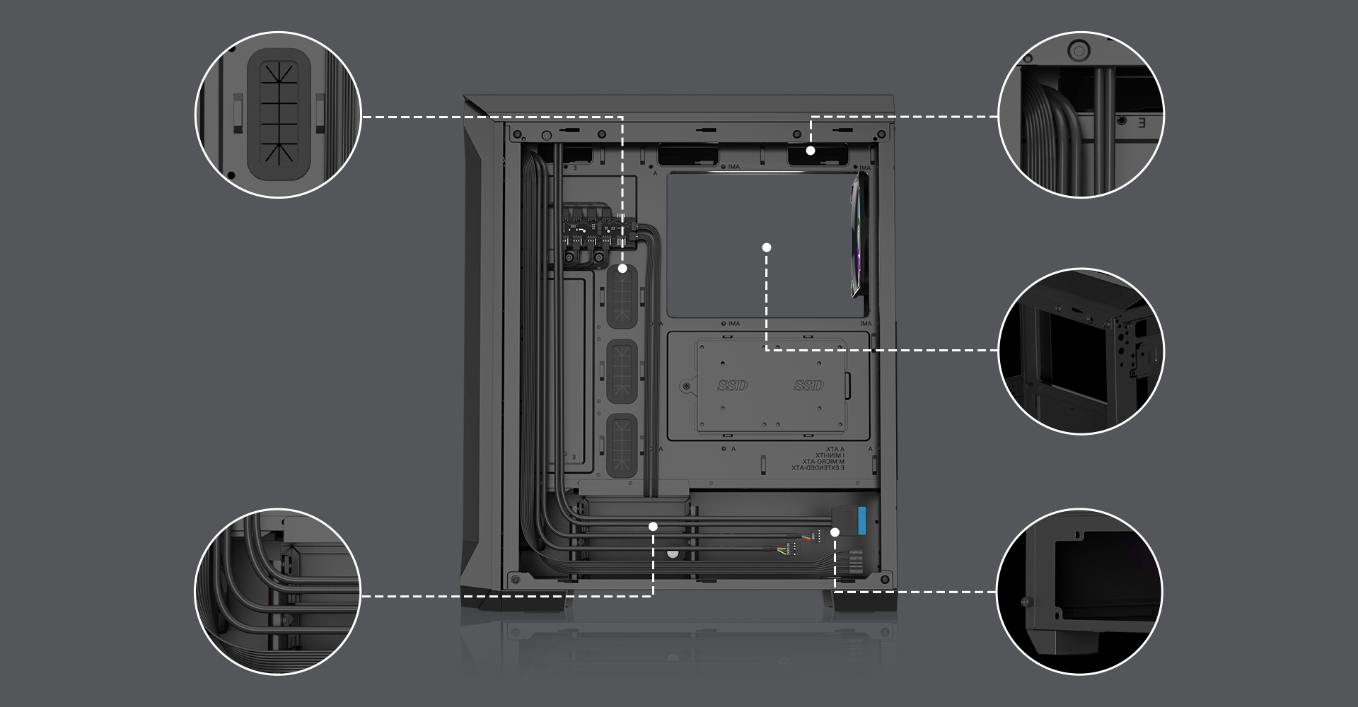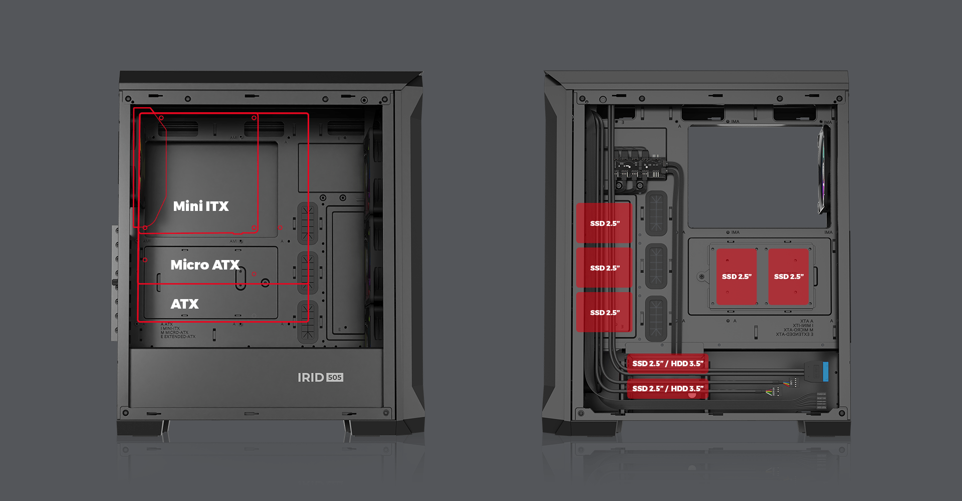 Dáváme vám do rukou plnou svobodu správy dat s rychlým přístupem. Irid 505 V2 ARGB vám dává možnost připojit až pět disků SSD. Kromě toho získáte prostor pro připojení dvou standardních pevných disků (nebo dalších 2 SSD). Skříň je také připravena pro 3 velikosti základních desek.