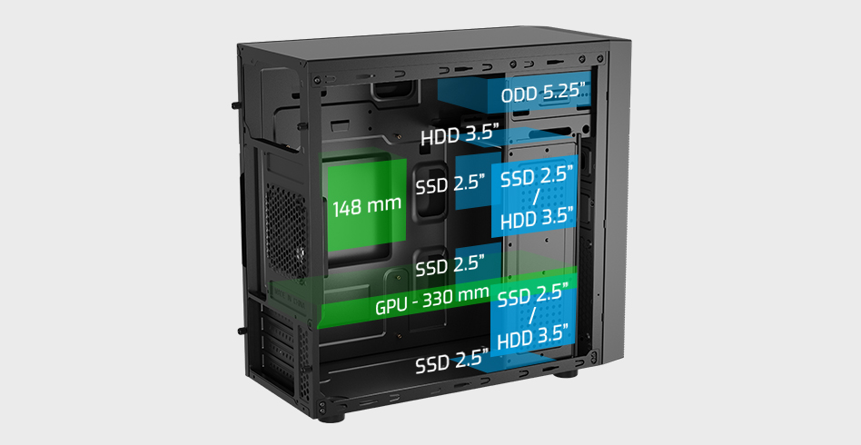 Oceňujete možnosti ukládání? Natec Helix pojme až šest disků! 3 sloty pro 2,5„ SSD, 1 slot pro 3,5“ HDD a 2 hybridní sloty pro 2,5„/3,5“ disky. Najdete zde také šachtu pro další 5,25“ zařízení, jako je DVD nebo Blue-ray mechanika. Do skříně Natec Helix můžete osadit grafickou kartu o maximální délce 330 mm a také věžový chladič procesoru (výška až 148 mm). Získáte tak širokou škálu možností konfigurace za přijatelnou cenu.
