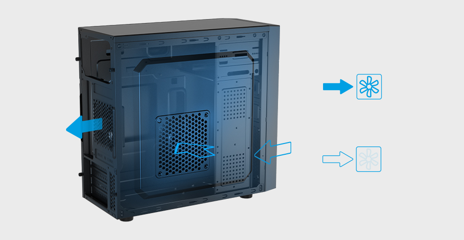 Optimální proudění vzduchu je důležitým aspektem, který jsme zohlednili při výrobě počítačové skříně Natec Helix. O odvádění horkého vzduchu se stará mimo jiné předinstalovaný 80mm ventilátor umístěný na zadní straně skříně. Můžete také nainstalovat dva další 120 mm ventilátory na přední a boční stranu skříně. Rychlé a jednoduché.