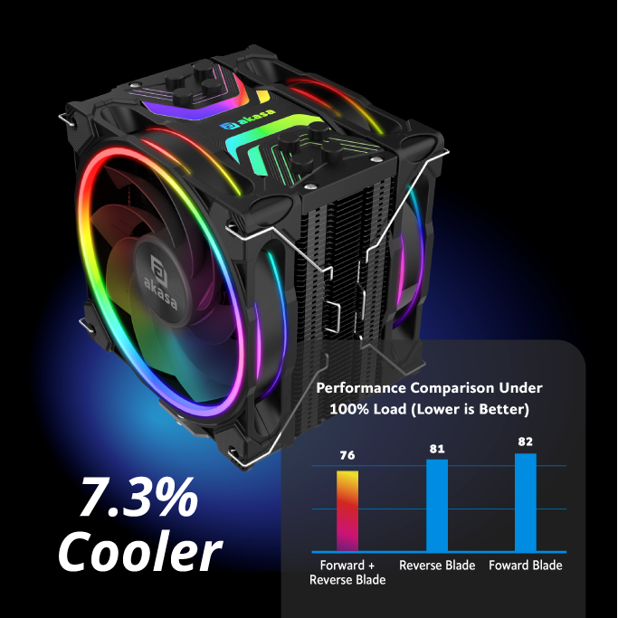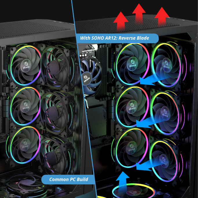 Zvyšte účinnost aĹľ o 7 % pĹ™idánĂm reverznĂho ventilátoru ke standardnĂ sestavÄ› věžovĂ©ho chladiÄŤe s jednĂm ventilátorem, jako je napĹ™Ăklad Akasa SOHO H4 Plus.