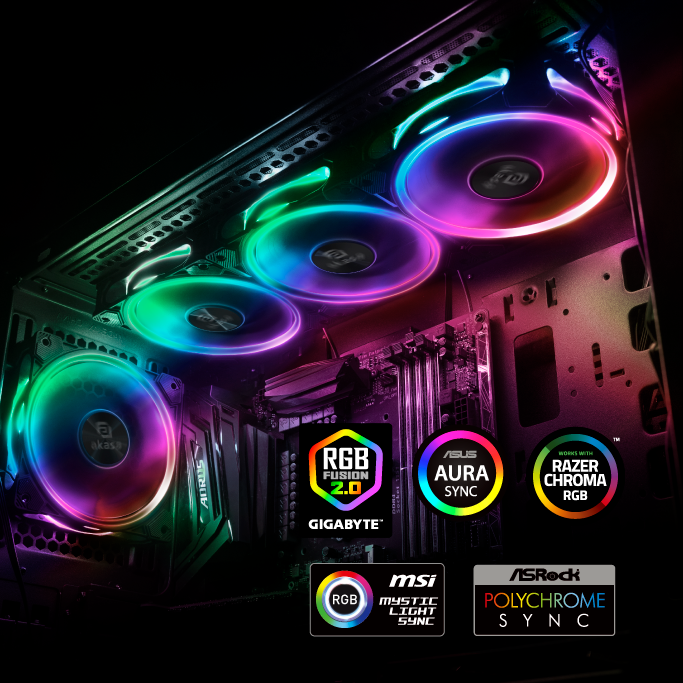 Na rámu je zabudováno 14 individuálnÄ› adresovatelnĂ˝ch uzlĹŻ RGB LED se 3 vĂ˝raznĂ˝mi zĂłnami svÄ›telnĂ©ho kruhu, kterĂ© vylepšujĂ rám ventilátoru a poskytujĂ jedineÄŤnou a futuristickou záři. ZaĹľijte mnoĹľstvĂ vizuálnĂch moĹľnostĂ s vĂce neĹľ 16,8 milionu barevnĂ˝ch kombinacĂ pro zcela pĹ™izpĹŻsobitelnĂ© osvÄ›tlenĂ. ZákladnĂ deska je synchronizována s populárnĂm RGB softwarem a je jĂm certifikována, vÄŤetnÄ› spoleÄŤnostĂ Asus, ASRock, Gigabyte, MSI a Razer.