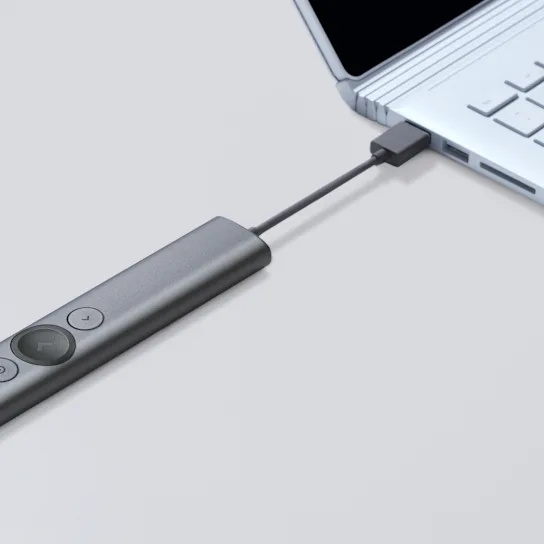 Logitech Spotlight Presentation Remote Bluetooth a USB. Digitální ukazování pro obrazovky Technické specifikace: Senzorová technologie -Pohybový senzor -3D akcelerometr a gyroskop Baterie -Výdrž baterie (nabíjecí): 3 měsíce -Typ baterie: Nabíjecí lithium-polymerová, 85 mAh Konektivita -Typ připojení: Bluetooth Low Energy a bezdrátové připojení 2,4 GHz -Bezdrátový dosah: 30 m Indikační kontrolky -LED: stav baterie a připojení
