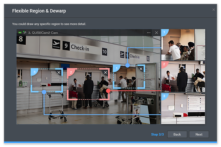 Funkce Region of Interest (ROI) umožňuje prohlížet více regionálních snímků ze stejné kamery v režimu živého náhledu a přehrávání. Můžete definovat a zvětšit více oblastí a sledovat tak danou oblast podrobněji.