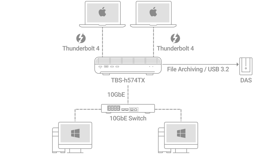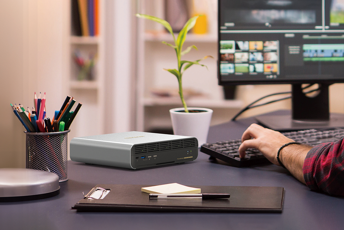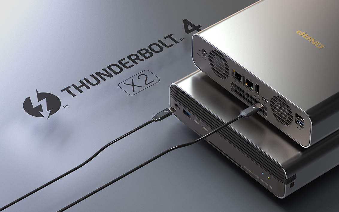 * dva porty Thunderbolt™ 4 umožňují přímé připojení pracovních stanic Mac®/PC k TBS-h574TX a poskytují až 20Gb/s pro úpravy 4K videa