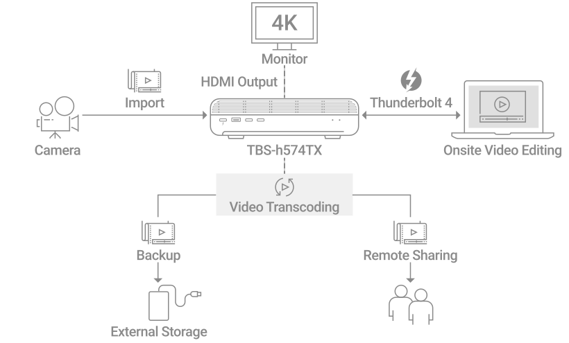 TBS-h574TX má dva porty Thunderbolt™ 4 pro vysokorychlostnĂ pĹ™enos dat (šĂĹ™ka pásma aĹľ 20 Gb/s). PracovnĂ stanice Mac® (vÄŤetnÄ› modelĹŻ s ÄŤipy M1 a M2) nebo Windows® se mohou pĹ™Ămo pĹ™ipojit k zaĹ™ĂzenĂ TBS-h574TX pro rychlou a plynulou editaci videa v reálnĂ©m ÄŤase, coĹľ umoĹľĹuje pĹ™enĂ©st 1TB video 4K za pouhĂ˝ch 11 minut.