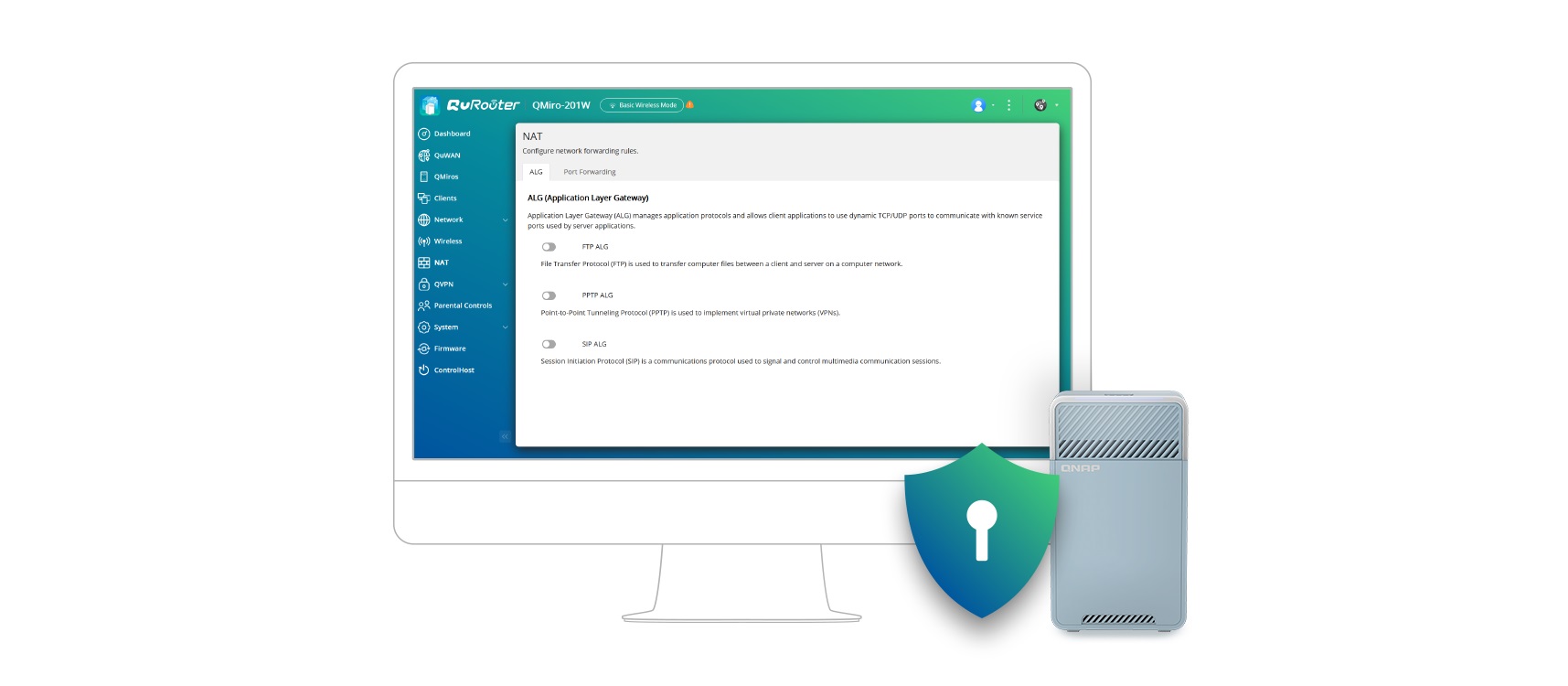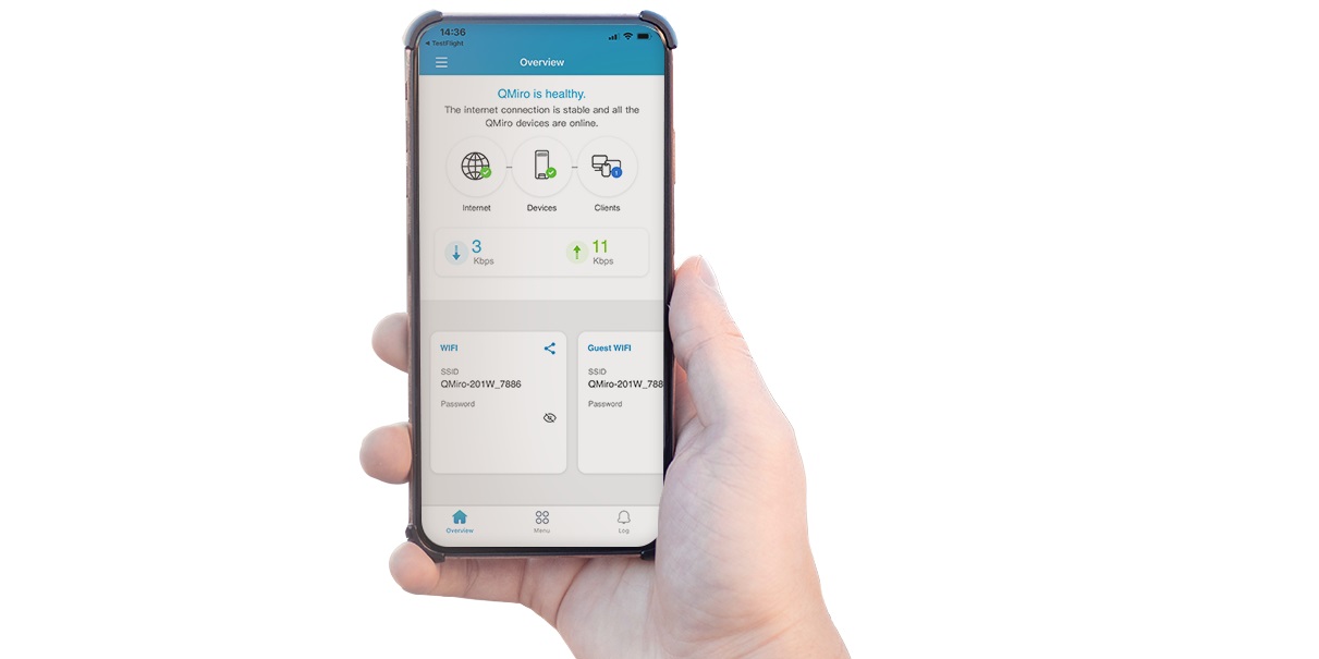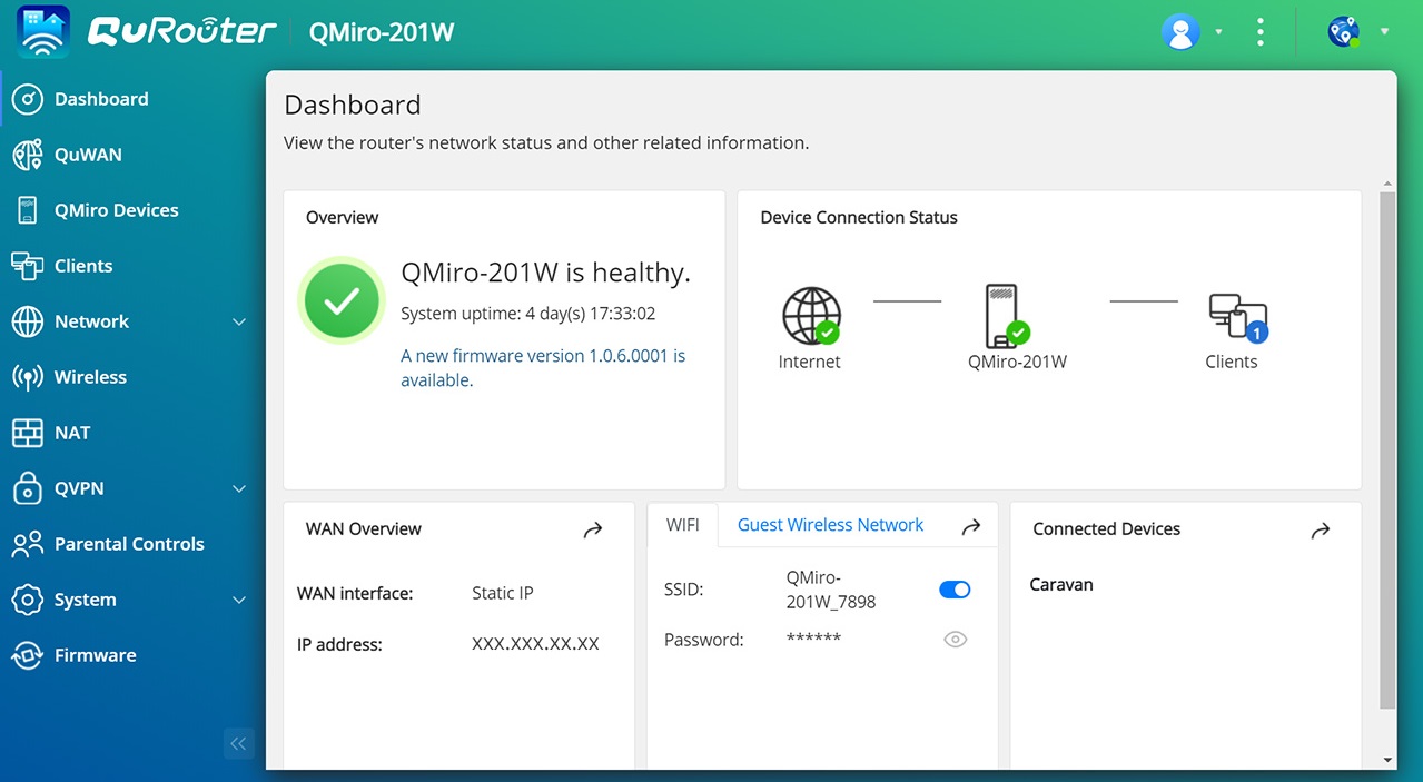 Díky webovému grafickému uživatelskému rozhraní a přehlednému ovládacímu panelu poskytuje QuRouter OS uživatelsky přívětivé rozhraní pro každodenní správu sítě. Zařízení QMiro-201W také podporuje konfiguraci bezdrátového směrovače nebo režimu AP přes QuRouter OS, což umožňuje odeslání IP adresy jako hlavního směrovače nebo příjem IP adresy z jiného hlavního směrovače. S QuRouter OS mohou uživatelé nejen efektivně spravovat všechna připojená kabelová a bezdrátová zařízení v reálném čase, ale mohou také konfigurovat pokročilé funkce NAT, VPN, zabezpečení a QuWAN.