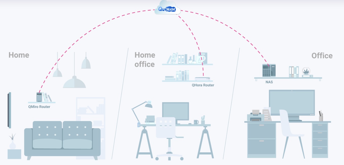 Práce z domova změnila život a každodenní postupy pracovníků i podniků, nyní je však výzvou zajistit, abychom byli k podnikovému IT vždy připojeni bezpečně. QNAP QuWAN je řešení SD-WAN, které umožňuje vytvořit automatickou topologii sítě mesh VPN od korporátních sítí, až po osobní domácí směrovače. Jakmile nastavíte své domácí zařízení QMiro-201W, umožní nástroj QuWAN Cloud Orchestrator připojení zařízení QMiro-201W k síti mesh VPN v režimu směrovače. Potom bude zařízení QMiro-201W bránou do firemního cloudu. Můžete dokonce připojit úložiště NAS z vaší společnosti k vašemu zařízení QMiro-201W pro rychlý a pohodlný přístup k důležitým souborům a datům.