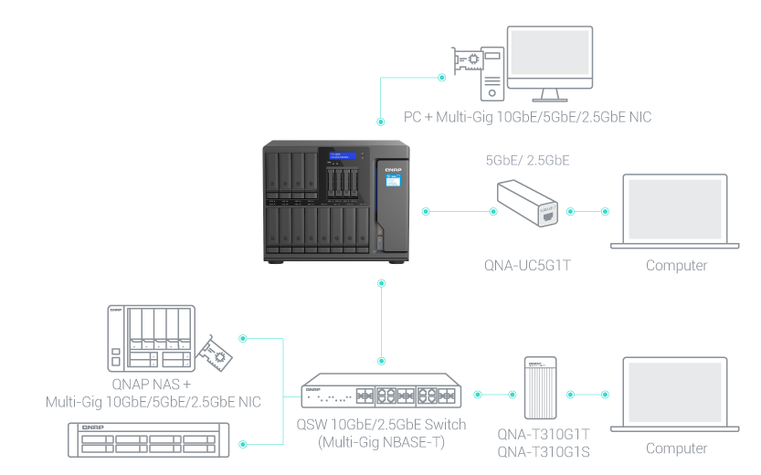 Díky dvěma nativním LAN portům 2,5GbE RJ45 (zpětně kompatibilním s 1G/100M) umožňuje model TS-1655 upgradovat rychlost sítě z 1 gigabitu na 2,5 gigabitu se stávajícími kabely CAT5e. Přenosová šířka a spolehlivost nezbytná pro náročné aplikace, mezi něž patří virtualizace, přenosy objemných souborů, vysokorychlostní zálohy/obnovy a aplikace v reálném čase, jsou dále podpořeny funkcí sloučení portů a podporou převzetí služeb při selhání. Společnost QNAP také nabízí řadu řízených/neřízených switchů 2,5GbE/10GbE, které pomáhají organizacím implementovat vysokorychlostní, zabezpečená a škálovatelná síťová prostředí bez překročení rozpočtu.