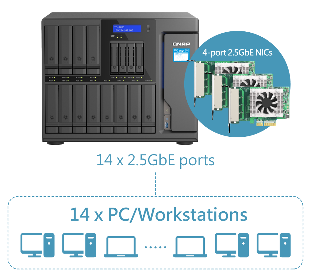 Váš tým potřebuje vysokorychlostní prostředí, které zvýší jeho produktivitu, a zařízení TS-1655 vám ho poskytne díky dvěma portům 2,5GbE. Díky instalaci tří 4portových síťových karet PCIe (QXG-2G4T-I225) lze model TS-1655 přímo připojit až ke 14 počítačům/pracovním stanicím – aniž by bylo potřeba použít switch – pro rychlejší přenos/zálohování velkých souborů, střih videa a spoustu dalšího.