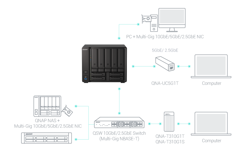 TS-h973AX má jeden port 10GBASE-T Multi-Gig (10G/5G/2,5G/1G/100M) a dva porty 2,5GbE RJ45 (2,5G/1G/100M), které poskytují podporu vysokorychlostních sítí a podporují Port Trunking a Failover pro posílení vaší síťové infrastruktury. QNAP nabízí také mnoho dalších vysokorychlostních síťových řešení, včetně spravovaných/nespravovaných přepínačů 10GbE/2,5GbE, karet PCIe 2,5GbE/5GbE/10GbE a adaptérů USB 5GbE pro pracovní stanice se systémem Windows®/Linux®, které vám umožní vytvořit cenově výhodné vysokorychlostní síťové prostředí pro produktivní týmovou spolupráci.