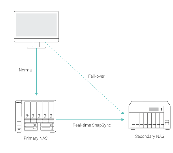 SnapSync v reálném čase zajišťuje, že primární i sekundární NAS uchovávají identická data. Když jsou data zapsána na zdrojový server, jsou okamžitě zapsána na cílový. Pokud dojde k výpadku primárního NAS, mohou pracovníci IT jednoduše upravit nastavení oprávnění sekundárního NAS a zajistit tak nepřetržitý provoz. SnapSync poskytuje nejsilnější podporu pro nepřetržitý obchodní provoz a pomáhá uživatelům snížit riziko ztráty dat.