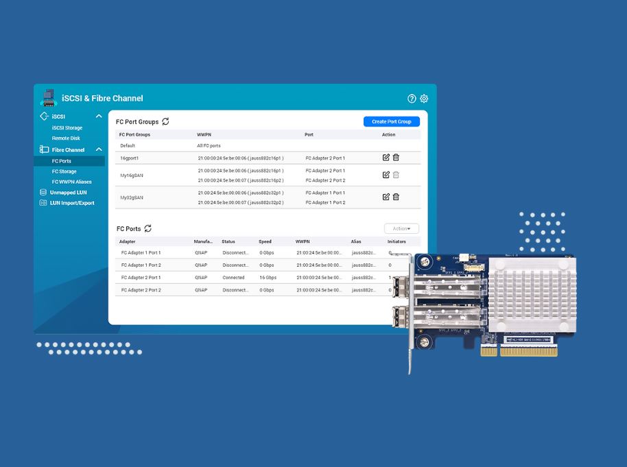 Běžná zařízení Fibre Channel Storage Area Networks (SAN) jsou často nákladná. Instalací rozšiřujících karet QNAP se dvěma porty 16Gb Fibre Channel do TVS-675 získáte cenově výhodnější možnosti, jak přidat NAS do prostředí SAN. Pomocí aplikace iSCSI & Fibre Channel můžete nastavit cíl Fibre Channel Target. Funkce LUN Masking a Port Binding navíc poskytují další vrstvu zabezpečení dat.