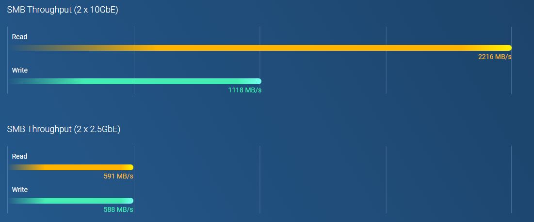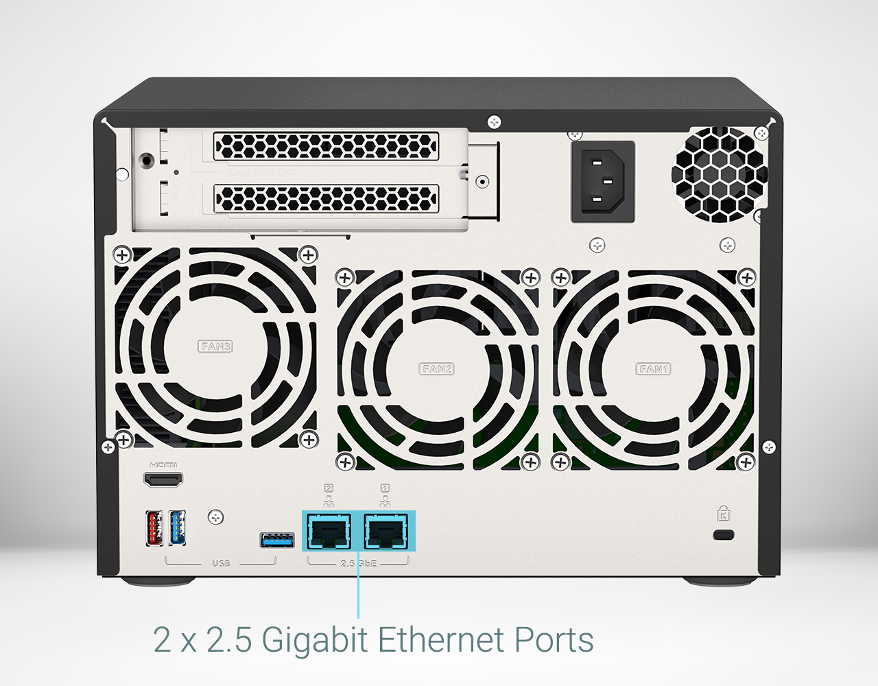 TVS-675 je vybaven dvěma porty LAN RJ45 2,5GbE (2,5G/1G/100M), které umožňují použít stávající kabely CAT5e a zvýšit rychlost sítě z 1 Gigabitu na 2,5 Gigabitu. Dva porty 2,5GbE také podporují funkci Port Trunking pro přenosové rychlosti až 5 Gb/s, což zvyšuje efektivitu podnikání u aplikací náročných na šířku pásma, jako jsou přenosy velkých souborů, rychlé zálohování/obnovení a přenos a editace multimédií.
