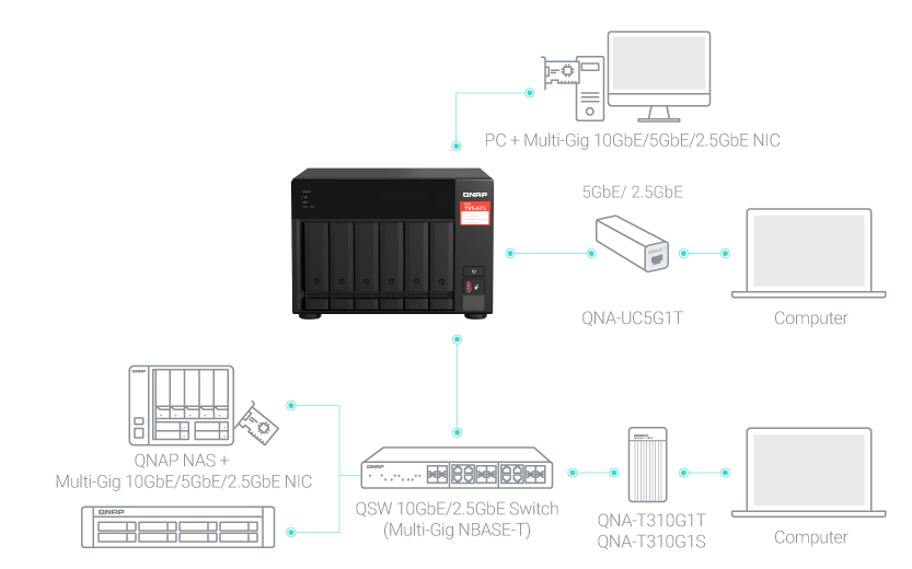 TVS-675 je také ideálně sladěn s řízenými a neřízenými přepínači QNAP 2,5GbE/10GbE, aby bylo možné vytvořit vysokorychlostní, bezpečné a škálovatelné síťové prostředí bez překročení rozpočtu. Společnost QNAP také nabízí karty PCIe 2,5GbE/5GbE/10GbE a adaptéry USB 5GbE pro pracovní stanice se systémem Windows®/Linux®, které vám umožní snadno vytvořit vysokorychlostní síťové prostředí pro produktivní týmovou spolupráci.