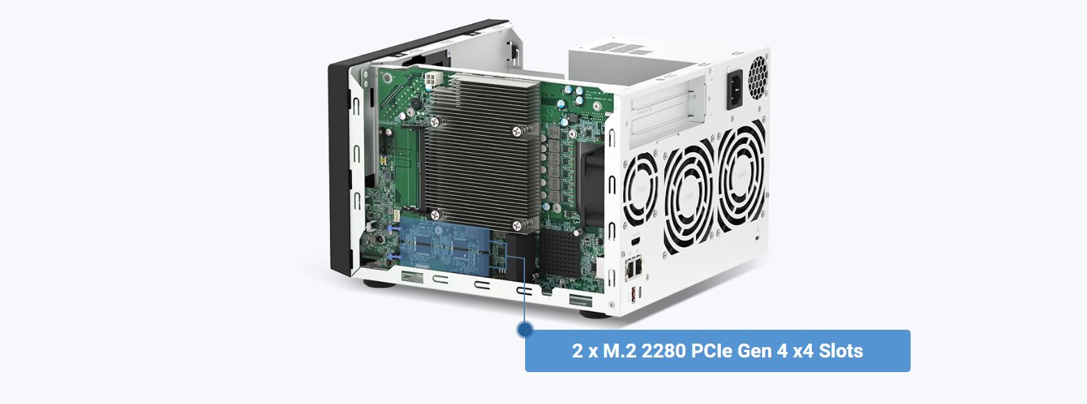 TVS-h674 má dva sloty M.2 PCIe, které umožňují ukládání SSD do mezipaměti nebo sdružování SSD úložišť pro zvýšení výkonu nebo jiné aplikace.