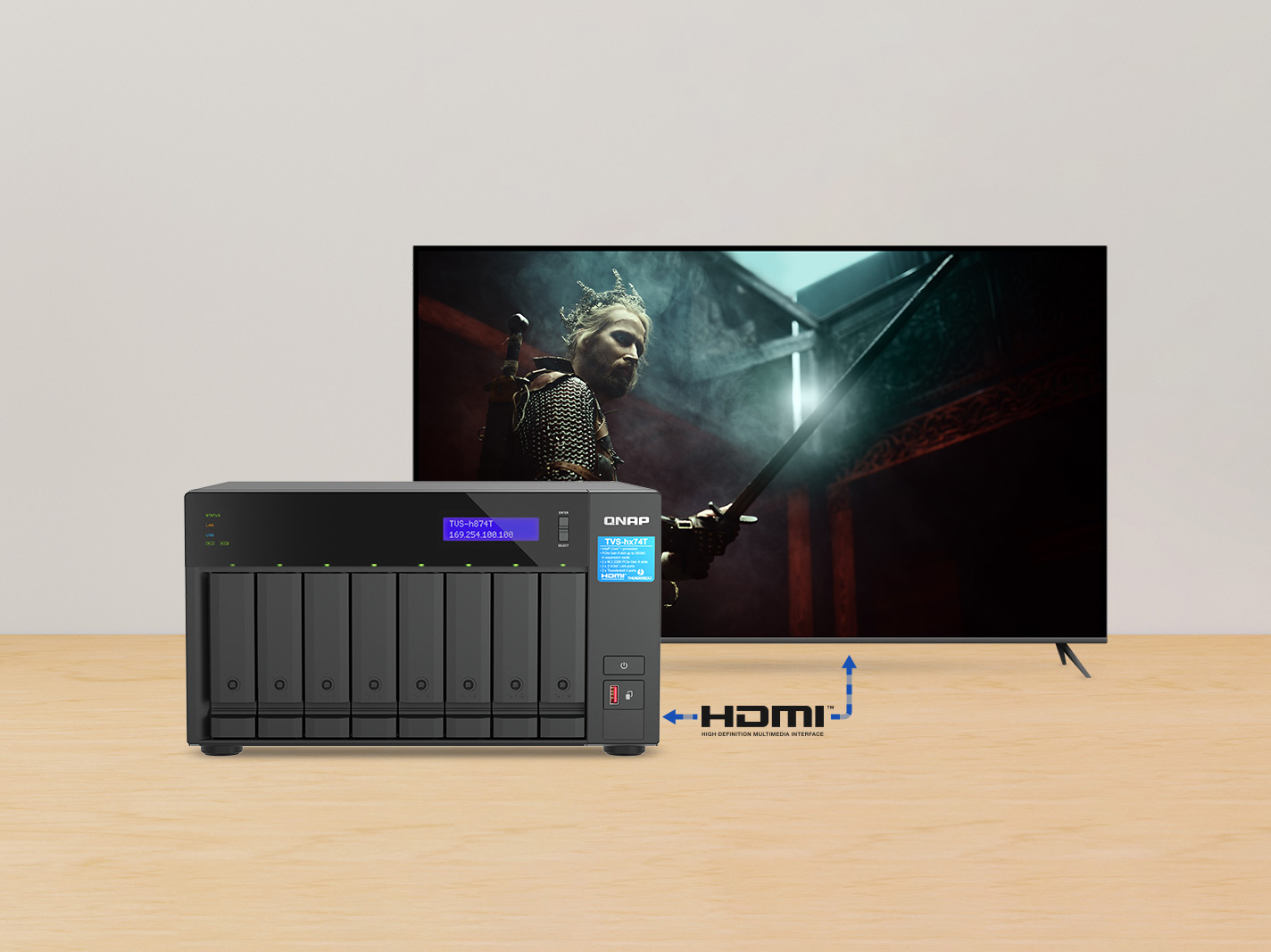 TVS-h874T je vybaven výstupem HDMI™ pro monitor, který podporuje rozlišení 4K (4096 x 2160p) @30Hz, což je velkým přínosem pro aplikace, jako je produkce/střih videa nebo průmyslový design, které vyžadují vysoké rozlišení a intenzivní ukládání, přenos a zobrazení médií.