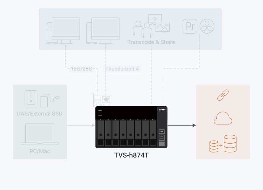 Zcela nový Thunderbolt™ 4 NAS je skvělý pomocník pro vaši kreativitu. TVS-h874T je dodáván s výkonným 16jádrovým procesorem Intel® Core™ i9 a umožní vám plynule a současně vytvářet 4K video projekty. NAS TVS-h874T založený na ZFS zaměřený na tvůrce zaručuje dobře organizovanou spolupráci a rozšiřitelnost hardwaru (jako je rozšiřitelná konektivita 25GbE a 64GB RAM), aby držel krok se zvyšujícími se požadavky.