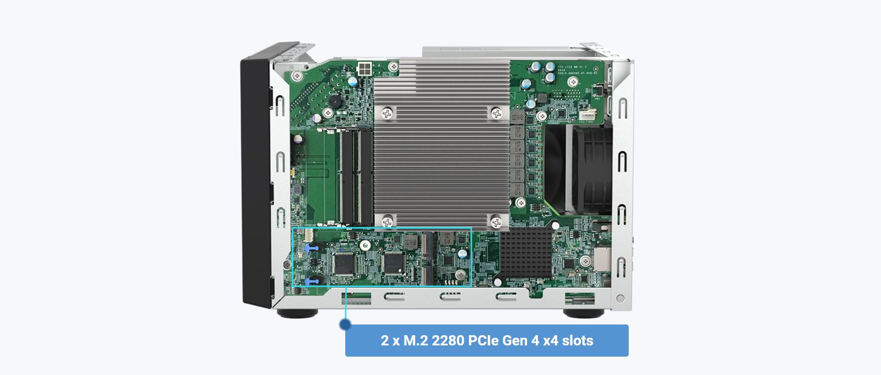 TVS-h874T je vybaven dvěma sloty PCIe Gen 4, které umožňují přidat další funkce (například vysokorychlostní síťovou konektivitu) a vyhovět tak rostoucímu pracovnímu zatížení a firemním požadavkům.