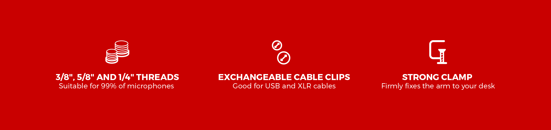 Rameno Thulium 700 se dodává až se dvěma sadami vyměnitelných svorek pro kabely USB a XLR o tloušťce 6 mm , resp. 8 mm. Každá sada obsahuje 4 svorky, 2 pro každou z dlouhých částí ramene. Díky nim můžete zabránit uvolnění kabelů (zejména tenčích USB kabelů) a zachovat dokonalý pořádek a estetiku na pracovišti, což je důležité zejména v profesionálním nahrávacím prostředí.