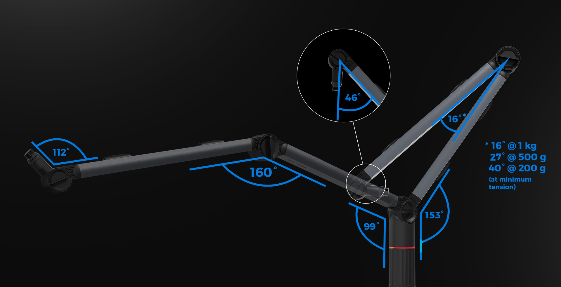 Díky své speciální konstrukci umožňuje rameno Thulium 700 velkou flexibilitu, pokud jde o úhly ohybu, a tím i snadnější nastavení polohy mikrofonu ve srovnání s jinými rameny na trhu. Spodní část ramene lze ohnout dozadu maximálně o 152° při zachování úhlu 55,5° mezi ní a horní částí. Tato funkce je mimořádně užitečná pro hráče, streamery a tvůrce obsahu, protože umožňuje umístit příslušenství blízko obličeje a zároveň udržet rameno v požadované poloze v záběru nahrávání. Maximální úhly ohybu jsou znázorněny v grafice - je třeba poznamenat, že se mohou mírně lišit v závislosti na nastaveném napětí.