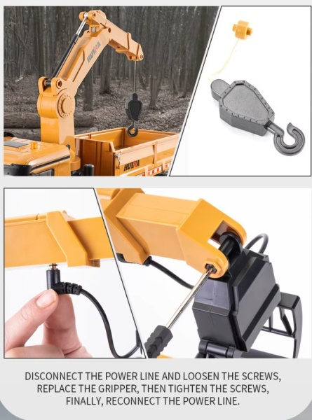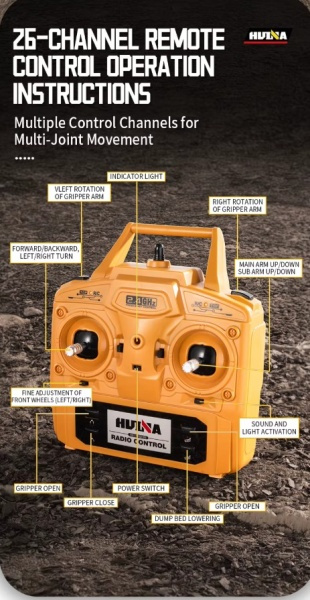 Obsah balení: RC auto HN538 Dálkové ovládání 2,4 GHz Akumulátor Li-Ion 7,4 V 1200 mAh USB nabíječ Drapák, drapák na dřevo a kovový hák Míček, 3 ks dřeva Šroubovák Klíč Náhradní šroub s maticí Technické parametry: Měřítko: 1/14 Konstrukce auta: nákladní Délka auta: 51 Šířka auta: 15 Výška auta: 28 Hmotnost auta: 2600 Auto je vhodné na ven: ano Barva: Žlutá Auto je vhodné do interiéru: ano Typ motorů v autě: stejnosměrné Rychlost auta: 1 Kapacita akumulátoru v autě: 1200 Napětí akumulátoru v autě: 7.4 Typ akumulátoru do auta: Li-ion Typ nabíječky: USB Výměnný akumulátor v autě: ano Napájení ovladače k autu: 4xAA Doba jízdy auta: 40 Nabíjecí proud nabíječky: 500 Dosah ovládání auta: 25 Frekvence ovládání RC auta: 2,4Ghz Konstrukce ovladače k autu: Páčkový Plynulá regulace rychlosti: ano Plynulá řízení zatáčení: ano Voděodolnost (stříkající voda): ne Vodotěsnost (potopení): ne