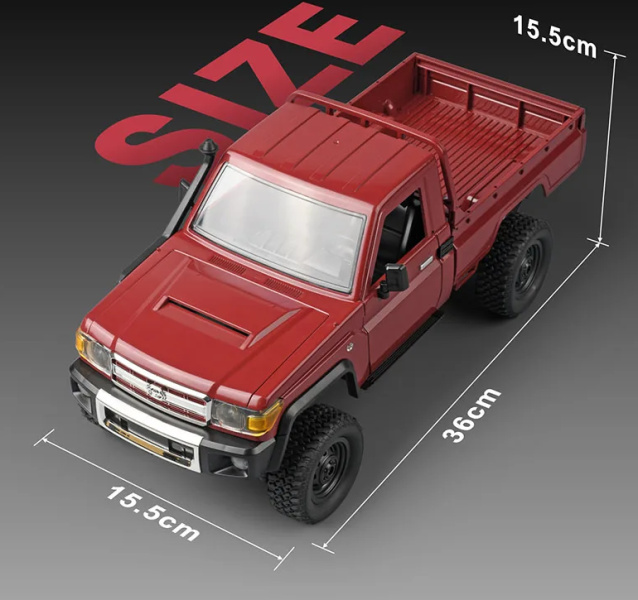 RC auto Land Cruiser TOYOTA 1/12Velmi precizně zpracovaný model na dálkové ovládání je pick-up licencovaný firmou Toyota. Vyrobený je z kvalitního a odolného plastu. Design je vyladěný do posledního detailu včetně interiéru kabiny. Auto s korbou můžete využít k pomalé jízdě terénem nebo převážení materiálu či plyšových kamarádů. Zadní strana korby se dá ručně sklopit pro usnadnění vykládky.Skvělé jízdní vlastnostiTrialové auto na dálkové ovládání Toyota nemá příliš vysokou rychlost, ale za to má sílu. Jízda v náročném terénu je pro něj to ideální prostředí a plně proporcionální řízení je opravdový zážitek. Pohybuje se rychlostí cca 8 km/h a přepínat můžete mezi rychlejším a pomalejším modem, kdy je rychlost cca 3 km/h. S pohonem 4x4 si poradí i se stoupáním pod úhlem 46 °. Světlá výška vozu je 40 mm. Měkké pneumatiky na kolech o průměru 62 mm vám zajistí skvělou trakci.Intuitivní dálkové ovládáníPistolový ovladač vám padne do ruky, ovládání s ním je snadné a intuitivní. Funguje na frekvenci 2,4 GHz, takže se nemusíte bát, že by se vám modely vzájemně rušily. Potřebujete do něj 2 x AA baterie. Díky trimrům se dá model bez problémů seřizovat. Zapnout či vypnout můžete přední LED osvětlení. Pod kapotou je ukrytý nabíjecí akumulátor Li-ion 7,4 V 500 mAh, díky kterému je doba jízdy cca 30 minut. Nabijete ho přiloženou USB nabíječkou. Pokud byste si chtěli dobu jízdy prodloužit, je možné zakoupit náhradní silnější akumulátor s kapacitou 1200 mAh nebo akumulátor s kapacitou 2500 mAh.Součástí jsou i samolepky, můžete si tak model odekorovat podle představ. Obsah balení: RC pick-up Toyota Dálkové ovládání Akumulátor 500 mAh Akumulátor 2500 mAh USB nabíječka Samoplepky Technické parametry: Měřítko: 1/12 Konstrukce auta: crawler Délka auta: 36 Šířka auta: 15.5 Výška auta: 15.5 Auto je vhodné na ven: ano Barva: červená Auto je vhodné do interiéru: ano Typ motorů v autě: stejnosměrné Rychlost auta: 8 Kapacita akumulátoru v autě: 2500 Napětí akumulátoru v autě: 7.4 Typ akumulátoru do auta: Li-ion Typ nabíječky: USB Výměnný akumulátor v autě: ano Napájení ovladače k autu: 2xAA Doba jízdy auta: 110 Dosah ovládání auta: 100 Frekvence ovládání RC auta: 2,4Ghz Konstrukce ovladače k autu: Pistolový Plynulá regulace rychlosti: ano Plynulá řízení zatáčení: ano Voděodolnost (stříkající voda): ano Vodotěsnost (potopení): ne