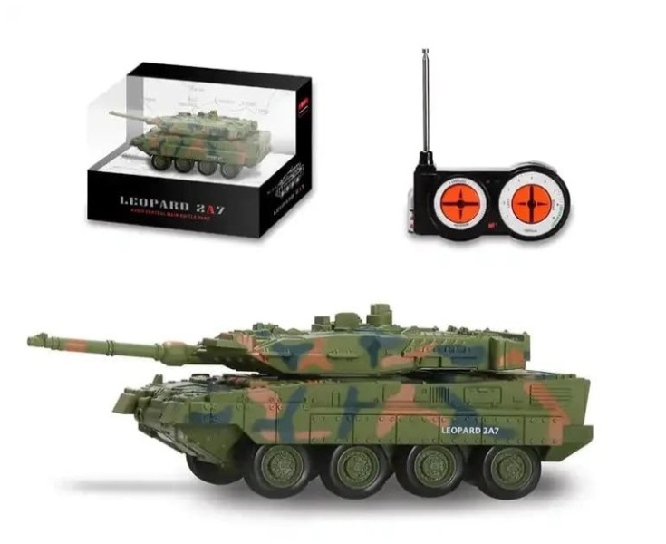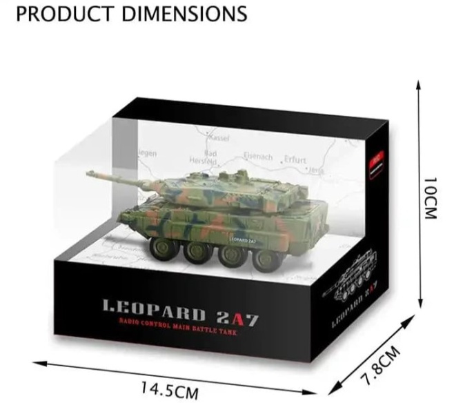 Obsah balení: Model tanku Ovladač s nabíjecím kabelem Anténa Technické parametry: Délka: 14 Šířka: 5.3 Výška: 5 Vhodný na ven: ne Vhodný do interiéru: ano Typ nabíječky: z ovladače Výměnný akumulátor: ne Napájení ovladače: 4xAA Dosah ovládání: 5 Osvětlení: ano Plynulá regulace jízdy: ne Vodotěsnost: ne Voděodolnost: ne Typ střelby: žádná Měřítko: 1/72 Rychlost jízdy: 3
