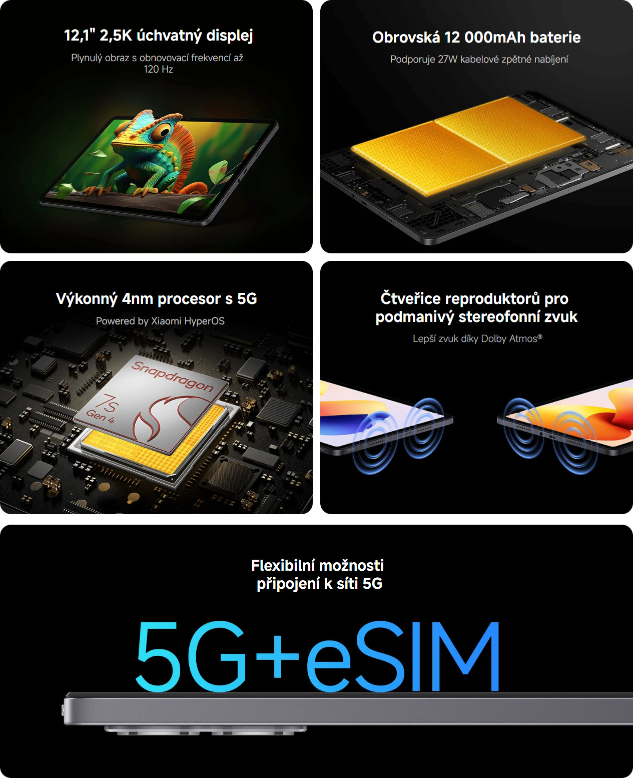 Reproduktory: vestavěné čtyřkanálové reproduktory podporující technologii Dolby Atmos