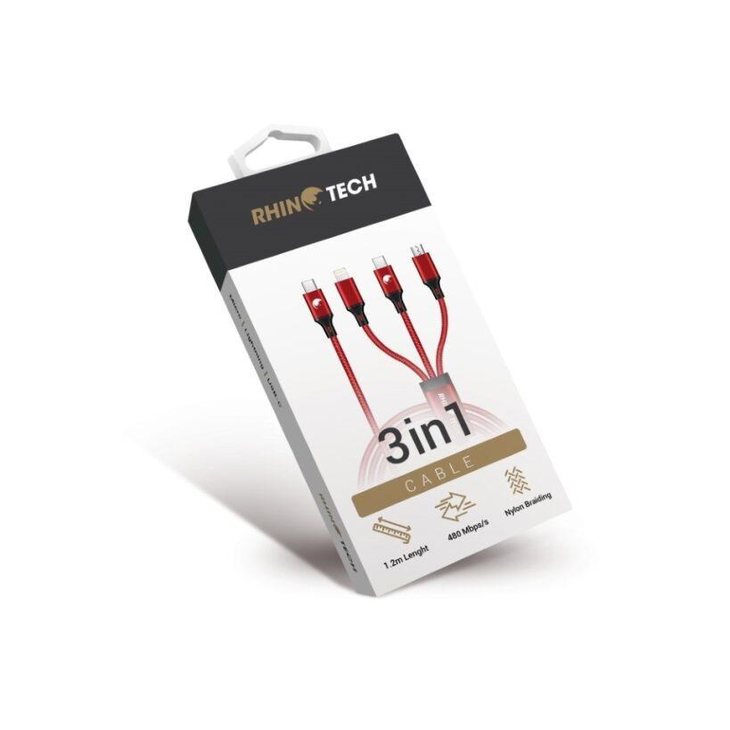 Kvalitní RhinoTech opletený multifunkční datový a nabíjecí kabel 3v1 s univerzálním konektorem USB-C, zakončený hned trojicí konektorů (Lightning nabíjecí, USB-C nabíjecí/datový port port a MicroUSB – nabíjecí port).