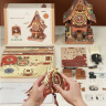Kukačkové hodiny jako z pohádky! Ukazují přesný čas, okouzlí Vás hravými detaily a přinášejí krásu tradičního řemesla. Představují lesní chaloupku ukrytou v kouzelném lese, doplněnou točícím se vodním kolem, dřevěným plotem a zahrádkou. Hodiny mají kukačku, kyvadlo ve tvaru půlměsíce, doškovou střechu a mnoho dalších prvků. Mezi hravé detaily patří symboly karetních motivů na střeše i ciferníku. Skrytý přepínač jako součást schodů umožňuje spustit zvuk kukačky nebo nastavit hodinový zvukový režim. Po zapnutí hodinového režimu vykoukne každou celou hodinu veselá kukačka z okénka, roztáhne křídla a zazpívá jemnou melodii. Zvuk kukačky a hodinový mechanismus jsou elektronicky propojeny. Skládačka využívá quartzový strojek řízený křemenným krystalem, který zajišťuje vysokou přesnost. Časový signál z hodinového strojku je spolehlivě přenášen do mechanismu kukačky. Teplé tóny osvětlení prozáří každý kout a vytvoří kouzelnou pohádkovou atmosféru.