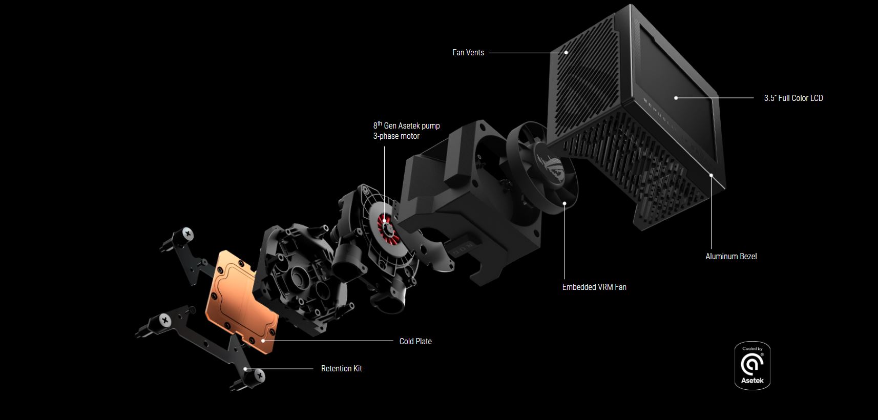Špičkový 3,5palcový LCD displej zabudovaný do bloku čerpadla umožňuje okamžité sledování taktovacích frekvencí, napětí, teplot, otáček ventilátorů a průtoku vody nebo vlastních GIFů.