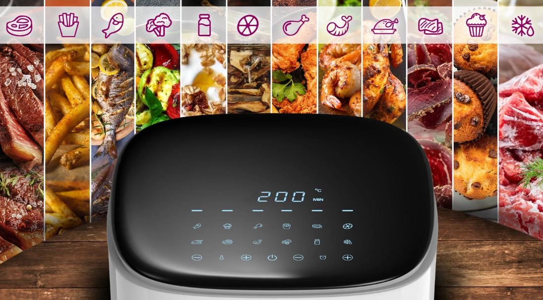 • 12 přednastavených programů: Ryby & Muffiny & Kuřecí stehna & Hranolky & Sušené maso & Sušené houby, ovoce a zelenina & Kuře & Steak & Krevety & Zelenina & Jogurt & Rozmrazování