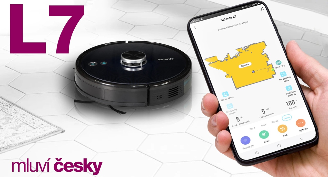 Vysavač hovoří v českém nebo anglickém jazyce. Řekne vám o ukončení úklidu, o nízké kapacitě baterie a o dalších více než sto situacích. A to je jeden z důvodů, proč je používání Salente L7 tak snadné.