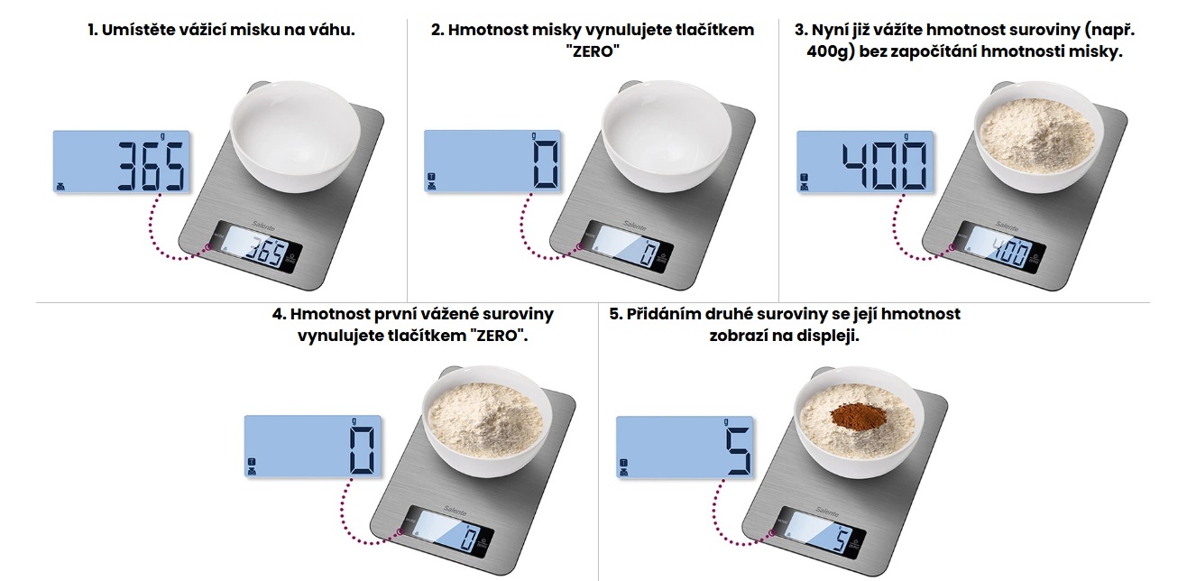 Funkce ZERO (nulování hmotnosti vážicí nádoby) & funkce TARA (postupné dovažování ingrediencí)
