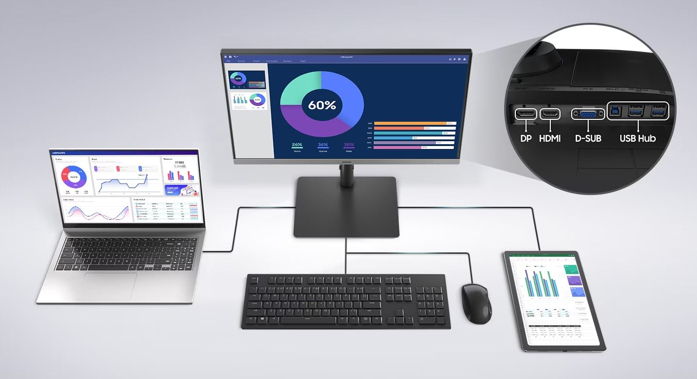 Množství různých obrazových vstupů přináší maximálně pohodlnou práci. Připoj k monitoru více zařízení díky integrovanému rozbočovači USB, HDMI portu, konektoru D-sub (VGA) a vstupu DisplayPort a snadno mezi nimi přepínej. Tím z monitoru vytvoříš výjimečně všestranné zařízení, které pohodlně využiješ pro každodenní práci i volný čas.