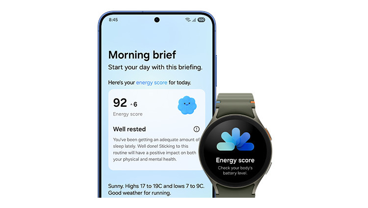 Jdi za svými cíli v oblasti zdravého životního stylu s funkcí Energy Score (Energy skóre). Synchronizuj ji s Galaxy Watch nebo Ring a získej personalizované poznatky a doporučení, jako je například analýza spánku, denní aktivity a srdečního rytmu.