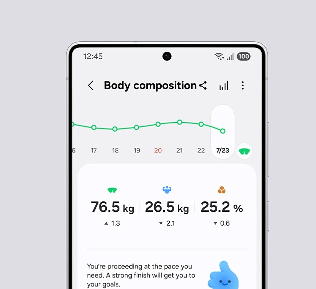 Pokračuj ve své cestě za lepší kondičkou díky snadnému měření složení těla. Polož prsty na Galaxy Watch8 a změř si klíčové ukazatele, jako jsou hmotnost, tělesný tuk a svalová hmota, díky kterým lépe porozumíš změnám ve svém těle. Na základě těchto údajů si stanov cíle pro každý ukazatel a podle toho uprav své tréninkové plány, ať už jde o nárůst svalové hmoty, nebo hubnutí.