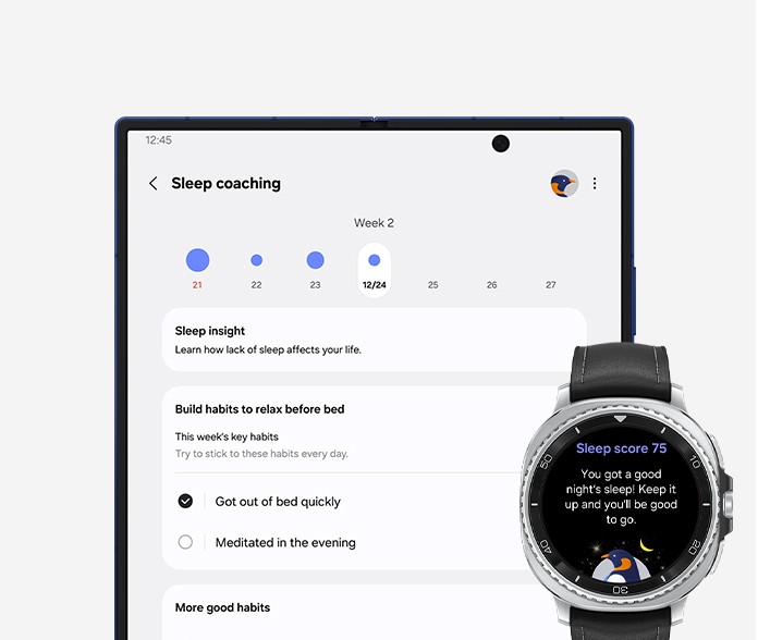 Díky Energy skóre toho zvládneš více a budeš se cítit skvěle – každý den, celý den. Na základě údajů, jako jsou průměrná délka spánku, aktivita v předchozím dni a srdeční frekvence během spánku, ti Galaxy AI poskytuje na míru přizpůsobené informace a proaktivní tipy, díky kterém můžeš optimalizovat svůj výdej energie od okamžiku probuzení až do chvíle, kdy jdeš spát. Začni v plné síle, měj energii po celý den a dokonči vše v té nejlepší formě.