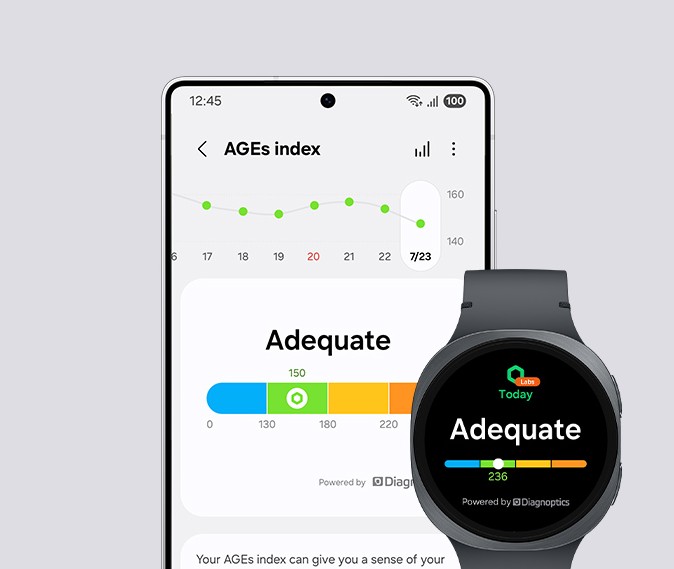 Starej se o zdraví svého metabolismu s Galaxy Watch8. Nošením hodinek při spánku se dozvíš více nejen o množství energie do následujícího dne, ale ohlídáš si i svůj index AGEs (Advanced Glycation End-products; Pokročilé produkty glykace). Galaxy Watch8 monitorují čtyři stupně AGEs, takže lépe porozumíš vlivu cukru na organismus. Navíc díky poskytnutým doporučením můžeš udělat správný krok ke zdravějšímu stáří a vyváženému životnímu stylu.