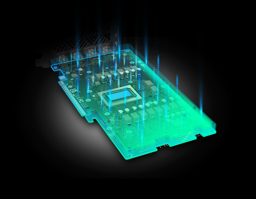 GrafickĂ˝ procesor je namontován na 12vrstvou desku plošnĂ˝ch spojĹŻ s vysokou hustotou, 2oz mÄ›dĂ a vysokĂ˝m obsahem TG, která odpovĂdá vysokĂ© rychlosti, vysokĂ©mu proudu a zvýšenĂ˝m nárokĹŻm na napájenĂ grafickĂ©ho procesoru a pamÄ›ti a zaruÄŤuje vysokou stabilitu desky plošnĂ˝ch spojĹŻ bÄ›hem provozu.