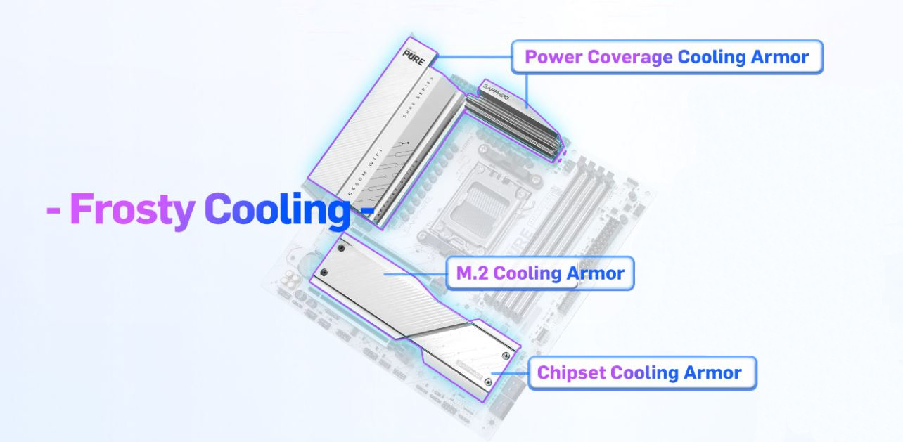 9950X/9950 X3D VyuĹľĂvá integrovanĂ˝, vysoce účinnĂ˝ chladicĂ plášť s velkou plochou. ÚčinnÄ› pokrĂ˝vá komponenty základnĂ desky s vysokĂ˝m tepelnĂ˝m vĂ˝konem. Poskytuje nepĹ™etrĹľitĂ© chlazenĂ pro VRM, M2 a ÄŤipovou sadu.