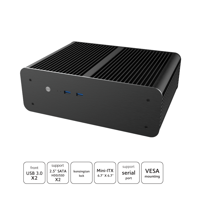 skříň bez ventilátoru s podporou pro spotřebitelské a průmyslové desky Intel® Mini-ITX