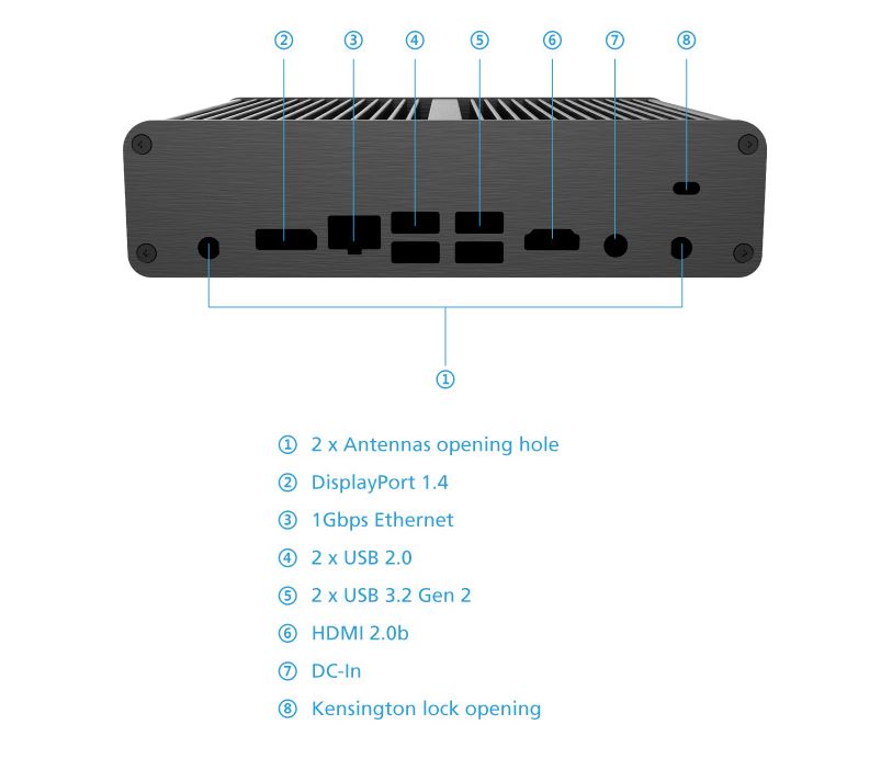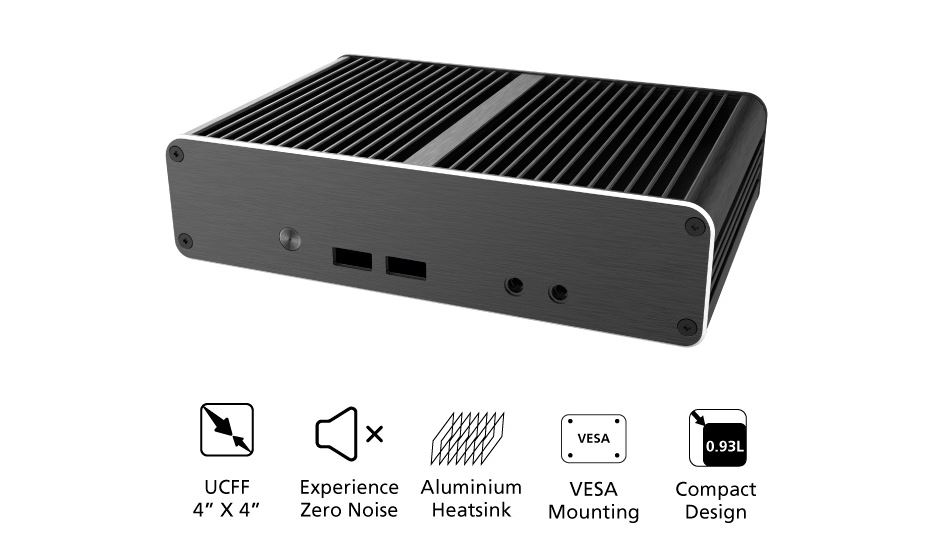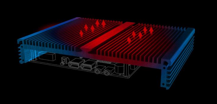 Zcela tichá skříň mini PC využívá celohliníkovou konstrukci chlazení procesoru bez ventilátoru, která funguje jako chladič a odvádí teplo do okolí.
