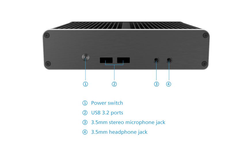 Přední panel: Power button, USB Type-A port x2, 3.5mm audio & microphone jacks