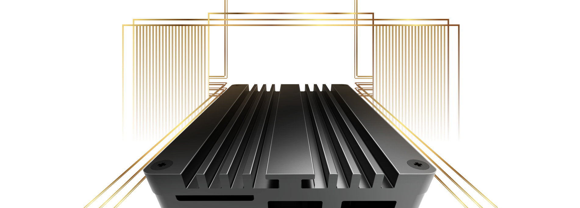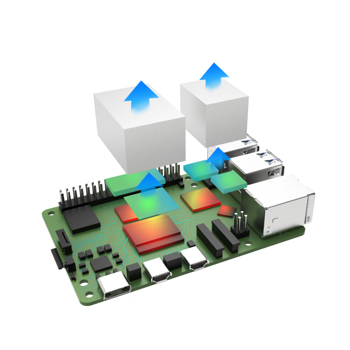 Dvě hliníková jádra spolu s vysoce výkonnou tepelnou podložkou odvádějí přebytečné teplo ze čtyř klíčových horkých zón procesoru, paměti, čipů PI a Ethernetu do hliníkového těla. Udržuje Raspberry Pi 5 v chladu a plynulém chodu bez tepelného škrcení.