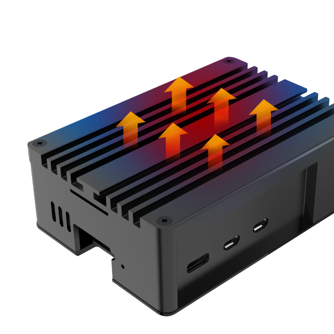Přebytečné teplo z dvojitých hliníkových jader vyrobených na zakázku se účinně přenáší do celohliníkového těla, které funguje jako chladič a odvádí teplo do okolí. Zajišťuje optimální tepelný výkon počítače Raspberry Pi 5 i při vyšším zatížení.
