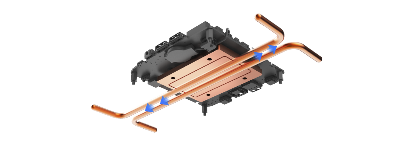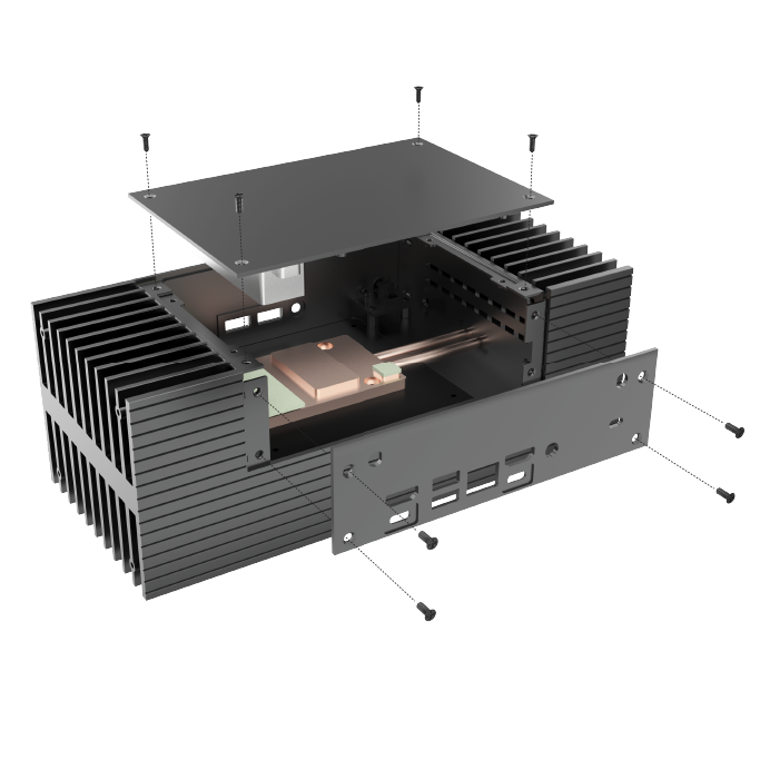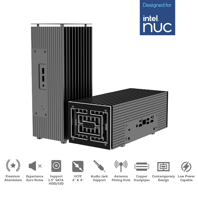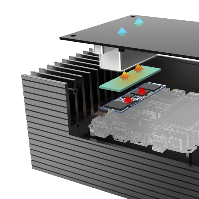 Biosymetrická extrudovaná žebra na obou stranách skříně maximalizují plochu vnějšího povrchu pro zvýšený odvod tepla. Ve spojení s vnitřně vysoce účinným pasivním měděným tepelným modulem a 6mm tepelnými trubicemi zajišťují splnění Thermal Design Point (TDP), přičemž skříň podporuje Intel® NUC 13 Pro až do 40W TDP.
